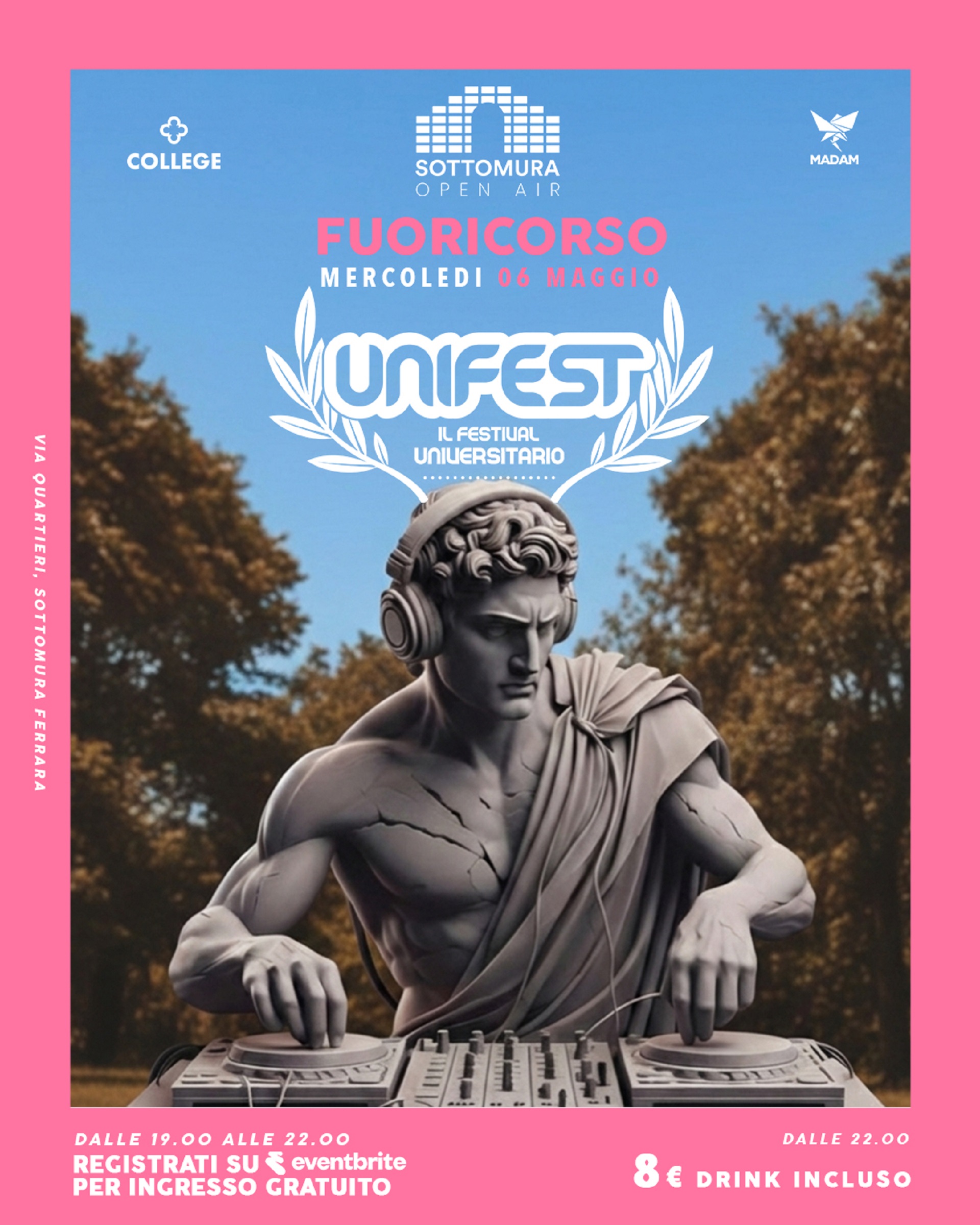 FUORICORSO – UNIFEST è molto più di una semplice serata. È un nuovo appuntamento pensato per studenti, giovani e per tutta la città: un grande evento open air dove musica, socialità ed energia si incontrano in un unico spazio. Un format che parte con un’atmosfera più rilassata e cresce nel corso della serata, trasformandosi in una vera esperienza collettiva firmata UNIFEST.